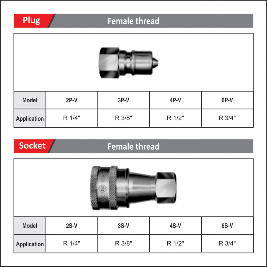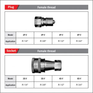 - Automatic sheet of valve in both sockets and plugs prevent fluid spill out on disconnection